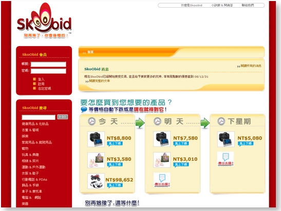 上周,有一個很有意思的新購物網站默默的在台灣開張,它叫做SkoObid。這個網站提出的是一個全新的「賣東西/買東西」的方式,打算為目前大家玩久也玩膩的「拍賣」帶來新感受。創業家將他發明的新拍賣機制稱為「Depressive Flow」,目前正在歐盟、美國、新加坡與台灣申請專利,這種拍賣的方式,是讓賣家為自己的商品先下一個「非常誇張的價錢」(exaggerated price),第一天就用這個價錢賣,到了第二天開始,就會自動的「逐日降價」,買家隨時可用當日價格將商品買下。由於商品往往只有這麼限量一個、兩個,買家若有膽量可以自己慢慢等,等到降價到了合意價錢再買下,但若怕被別人搶走?買家應該會快快急急的先買下吧!