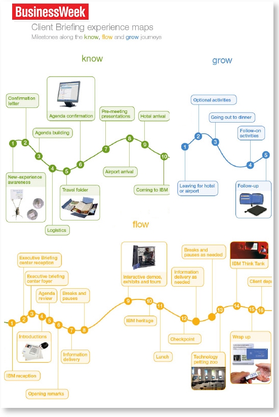 這個黃金流程分成三個步驟,分別為「Know」(事前的約訪與準備)、「Flow」(帶領客戶談生意的一天)、「Grow」(事後的追蹤)。圖中上上下下的「波浪狀」,暗示了何時是高潮、是重點、是客戶精神最高昂處,何時又是較輕鬆的休息時間、可以墊襯的隨意時段。這套流程很詳細的敘述了一個客戶來到IBM辦公室,一整天要帶他去哪裡?做什麼?說什麼話?最後的一步,當然就是希望此客戶能簽下合約,讓IBM又進了一筆生意。