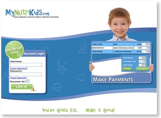 「MyNutrikids」是一個位於紐約州的網站,你說,啊呀,就是讓小朋友更營養的網站嘛,沒什麼!不,這個網站的重點不在「營養」,如這個簡介所述,它做的是一個更重要、更直接的需求──有些孩子由於家裡不帶便當,因此必須訂購學校的營養午餐,在美國訂餐不像台灣叫便當而且也不乾淨,既然學校要提供這種營養午餐服務,學校的餐廳(cafeteria)要開始賣各種營養午餐,那,所有學生最好都來學校吃,不要帶自家的三明治好嗎?但,父母是無法被強迫的,所以學校必須讓父母更相信他們、更方便的讓父母想要訂營養午餐才行。「MyNutrikids」把自己卡在這個需求點上,提供下列服務:父母可以將營養午餐的錢預先「存」到MyNutrikids,孩子在學校買午餐,只要出示學生證就可購買,自動扣款(這部份是有和同公司的餐飲軟體結合),父母也會收到MyNutrikids的通知,便知道孩子今天中午吃了什麼東西,MyNutrikids事實上還告訴你這一個月以來孩子每天中午吃什麼,可以計算一下是否營養!換句話說,有了MyNutrikids,父母在家裡和小孩一起坐在電腦旁邊,一起和學校互動,不必等到所謂的「學校日」才能到校和老師互動,不必讓孩子還要拎著錢到學校繳給老師,孩子出門可以不必帶半毛錢也無所謂。