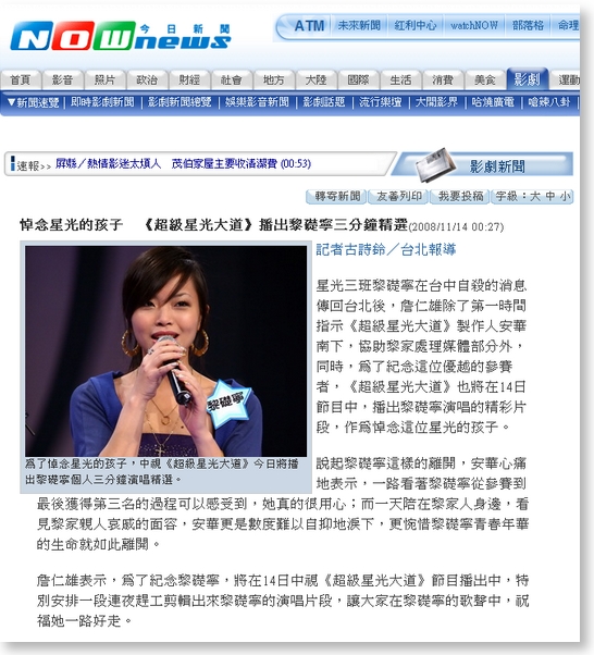 昨天星光三班第三名黎礎寧自殺消息震驚所有在看星光大道的觀眾,她的聲音、她的形貌,不久前還在電視上出現,它竟發生得這麼快,才24歲,怎麼可能這樣自殺了?(幸福點點名發起致黎礎寧家屬加油串聯在此)