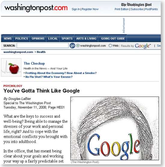 華盛頓郵報昨天刊出一篇由一位號稱有35年經驗在華府工作的社會心理師Douglas LaBier所寫的文章「You’ve Gotta Think Like Google」,也就是說「我們都要學習Google思考的方式」。