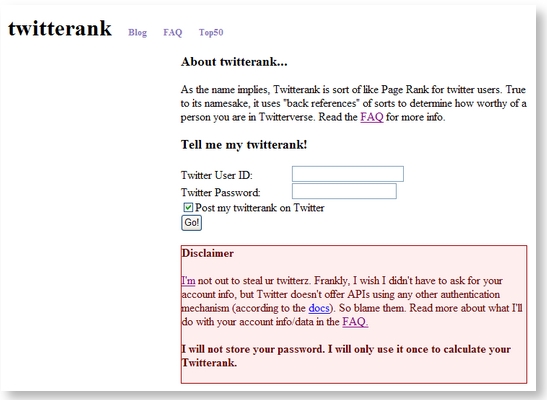 有趣的是,我還以為,只有亞洲人這麼瘋排行榜?原來老美也愛,而且愛得什麼都不怕。這個「推特觀察」為了收集大家排行資料,要求必須給它你在Twitter的帳號、密碼。這種事我們之前也幹過,我們的想法是,多多益善,沒有也可以work,但「推特觀察」是,你不給密碼就無法計算,也就無法列入排名。你說,這樣很奇怪?我之前在survey時發現,其實不必帳號密碼就可以透過Twitter API看到許多東西,就算看不到用爬螢幕的也行,但「推特觀察」的作者在站上說只用「follower count」等等的指標來排行「太遜了」,他要像Google一樣導入很有深度的排序法(我猜他至少要拉入每日回覆的頻率),當然,給了帳密,作者也順便代使用者自動貼公告,把自己的推個觀察排名隨時讓朋友知道。作者說,這個推特觀察的演算法是「vewy vewy secwet」(故意拼錯),他唯一能透露的是名次目前是每天「只算一次」。