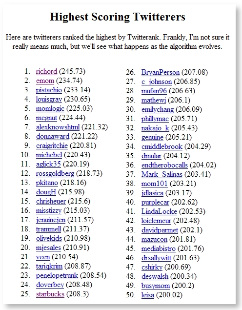 但,昨天有一件事襲捲了最近有些低迷的美國矽谷,因為,真的有人推出了「推特觀察」(Twitterank)!目前,「推特觀察」中理出最新的推特前50名排行榜在這裡,第一名推友叫「Richord」,是WebProNews的創辦人、老網路人,第二名則是「eMom」,是一個女性網路創業家;其中排最高的企業推特是星巴克咖啡,排行第25名,知名美國部落客Emily Chang則排在第29名。重點是,這個網站,好像才剛剛開而已。