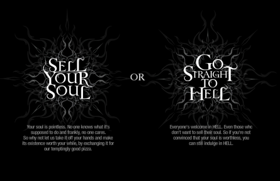 地獄比薩回答:「這隻靈魂,屬於『地獄』所有。沒有其它地方比『地獄』更適合它的了。」(The soul belongs to Hell. There is simply no better place for it.) 品牌印象,瞬間植入觀眾的腦中!