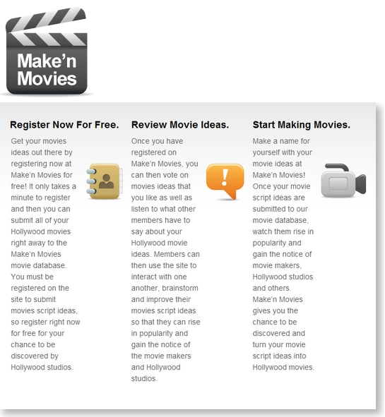我想,開這個MakenMovies網站的創辦人本身一定也是愛看電影,說不定自己常有一些想法,也投稿過電影公司,才會開這個網站。換句話說,這個站就算都沒有人來,只有他一人自己每天貼一個電影的點子,也不會太不好看,他自己也有一個爆紅的機會。