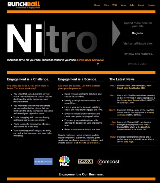再來看看Bunchball在做什麼事,提供什麼服務?它的主力產品叫「Nitro」,做的就是試圖用讓消費者積點數等等的各種方式,誘惑消費者可以多玩一點某個網站,難怪Peter先生會過去,因為仔細想想,這一段,剛好是每個網站從廣告以後就未解的大難題。