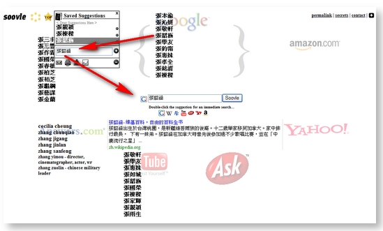 接下來,Soovle提供「bookmarking」的功能,譬如YouTube跳出一個「張靚穎」,覺得不錯,我們可將這個字「拖曳」到左上角的一本書裡,這個「張靚穎」就自動被記錄下來了(記在使用者的cookie裡),以後想再搜這個字,可以直接點上面就會帶你到那個站。