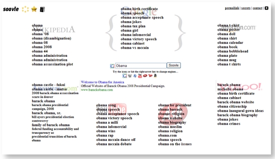 可能是因為這樣,還是有些網站偶爾冒出,像「Soovle」,這個網站「看起來」像是一個整合性的搜尋引擎,讓你同時搜Google、Yahoo!、Amazon、Wikipedia、Ask、Answers.com、YouTube七個網站?不,Soovle不只是一個整合搜尋引擎,整合搜尋引擎已經沒人要用了,就好像整合的IM,我寧可將MSN或Skype或QQ三個都打開,沒必要全部整合在一個。