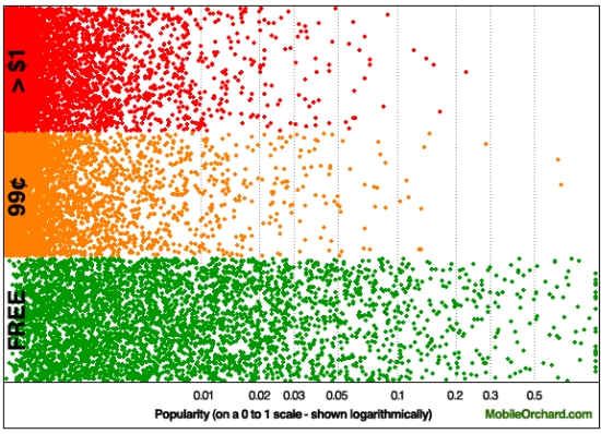 幾天前在Fortune有一篇蠻深奧但有趣的報導,關於iPhone目前的小軟體(app)定價問題,所謂iPhone的軟體就是你買了iPhone後可以下載到電話玩的軟體,大部份都不是蘋果自製的,而是其他創業家做的,目前iPhone可下載的軟體已高達11810個,有免費的,也有付費的,其中有4209個(36%)都採用「一美元」的定價,也就是只要台幣33元左右,就可以下載並使用這個小軟體。上面這個圖表原文是拿來解釋另一件事,我借用一下,說明一件事──