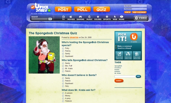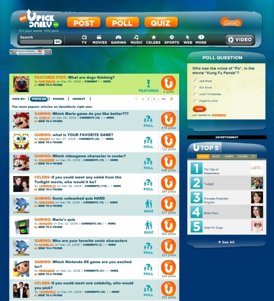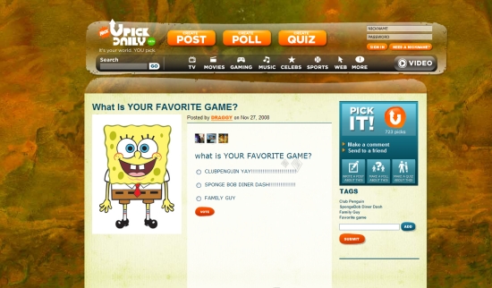 卡通大王Nickelodeon公司前天宣布開了一個新網站「UPickDaily.com」。這是一個給小朋友的Web 2.0網站。這個網站可以當他為部落格平台,使用者可以在這個網站提交三種內容物:寫一篇文章(Post)、做一份問卷(Poll)、或出一個小考題(Quiz),寫了以後,幫它分類,目前分為電視類、電影類、電腦遊戲類、音樂類、明星類、運動類、網路類…等,貼上去以後,還可以讓其他網友「推」,簡直就是專為小朋友設計的一個完整「Web 2.0」網站!