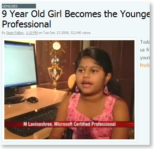 昨天傳出一則有趣新聞,印度有一位九歲的小女孩,已經考到微軟的證照!這是目前記錄上最年輕的考取者。這位考取的小朋友來自印度,不令人感到意外,印度就是這樣的國家。