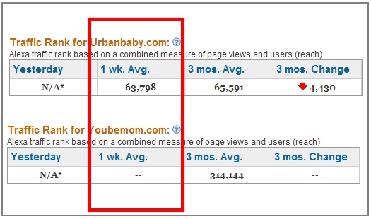 現在我還找不到這兩個數字,畢竟,要Alexa提供「一周的拜訪者」資料,真是很奇怪的事,不過,如果在Alexa查一查Urbanbaby.com的資料,以及YouBeMom.com的資料,如下圖所示: