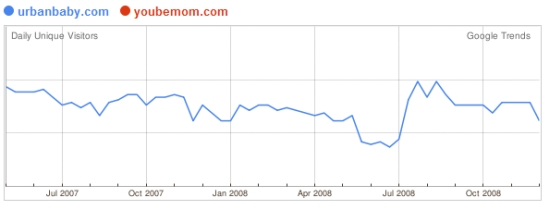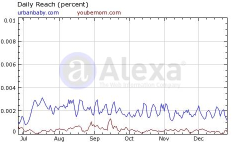 我跑去查了「Urbanbaby」和「YouBeMom」兩個網站的流量圖表,首先,在Google Trends和Quantcast上面竟然都查不到YouBeMom.com,因為流量太小。而我查到的Urbanbaby.com的流量,無論從Google Trends線圖或從Quantcast線圖來看,似乎從來沒有顯著的減少過。