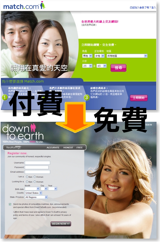 當然,Match.com的收入和POF比,應該還是贏得很多倍的,POF不敢貿然收費,而Match.com短期內也沒必要「突然不收費」,兩者成了恐怖平衡,但,網路上畢竟還是流量為大,有人就是老大,所以,Match.com連忙跑來做一個免費交友網站,以防「它成趨勢」。
