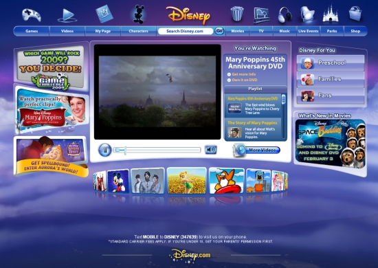 二、影片從未這麼四處的出現過:到迪士尼官網從到到尾都是flash做的,每一頁的選單和logo都是慢慢的跳出來,而且,頁面上的影片特別的多,所有的頁面幾乎都有影片,有的在左上角,有的在下方一個小框框……孩子就是不會讀長篇大論,故事書這麼多讀不完;讓一個孩子坐在電腦前這麼久,影音幫助很大。此外,據報導說迪士尼官網也會播放一些長片像《The Wonderful World of Disney and Camp Rock》很長,還有一些短片如《Kid’s Inaugural: We Are the Future》,接下來還有一些NG鏡頭像是《High School Musical 3: The Making of a Musical》將在一個星期後在網上上映。據另一份報導,它在這個寒假也已經推出三部新片的預告片,只有在線上看得到!難怪迪士尼除了取得兒童最大流量網站,同時也是兒童線上影音播放秒數最多的網站。