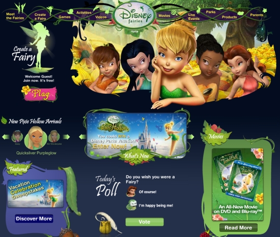 一、主題館其實「重新整理」過:迪士尼最大的資產大概就是這幾十年來它所拍攝的一些影片所塑造的那些「偶像」。若迪士尼在它的官網,讓每一個卡通人物都有一個「主題館」並不稀奇,稀奇的是,迪士尼將它們拆散還「重組」過。譬如,「小公主」就有「迪士尼小公主主題網站」,什麼是「迪士尼小公主」?喔,原來從白雪公主到睡美人,再到花木蘭,全都算在「小公主」下面,點下去還可以再往深一層,小女生應該是愛死了這個網站了!另外,還有「迪士尼小妖精」的專屬網站……等等。這點或許也可以運用在一般的網站上,許多網站為了打一個族群,可以拆散再拆散,但拆散了以後,若適當的把其中幾樣「重組」起來,或許出現不一樣的感覺,火力也瞬間併強,讓使用者進來有「wow」的瞬間酥麻的感動。
