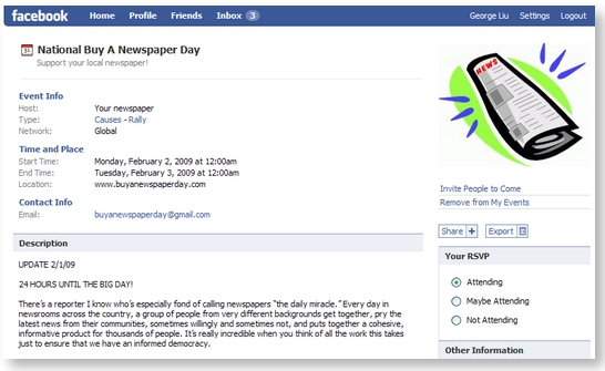 這位小記者厲害了,他使用了Facebook, 在Facebook裡面設立一個「Event」,event這個社群元素,就有如eVite一樣,讓你可以發表一個「活動」,讓他人報名參加,通常是拿來辦私人派對或一些社區活動用的,小記者就在Facebook設置一個「全國一起買報紙日」的event,告訴大家,支持報紙的時候到了。他悲哀的開場白,有些大報已經開始刪減「送到府上」的服務以節省成本,如果再這樣繼續下去,專家指出,美國有些小城鎮(包括他的城),到了2010年時將面臨「無報紙可看」的文化災難!