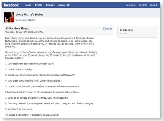 據報導,尤其到了上周,從1月26日到2月2日之間,這個「Notes」被「25件瑣事」給推得爆紅,據紐約時報說短短一周內竟狂增了500萬則「Notes」文章,會不會太誇張,500萬則!當然,每篇文章的內容乏善可陳,就只是25點「關於自己的事」而已,不過這500萬則可是讓「Notes」的文章量突然間整個加了一倍多,而每天tag的朋友數則是原來每天的五倍!換句話說,有五倍以上的人現在被不斷的提醒著:來看我的25件事喔!還看我的25件事喔!