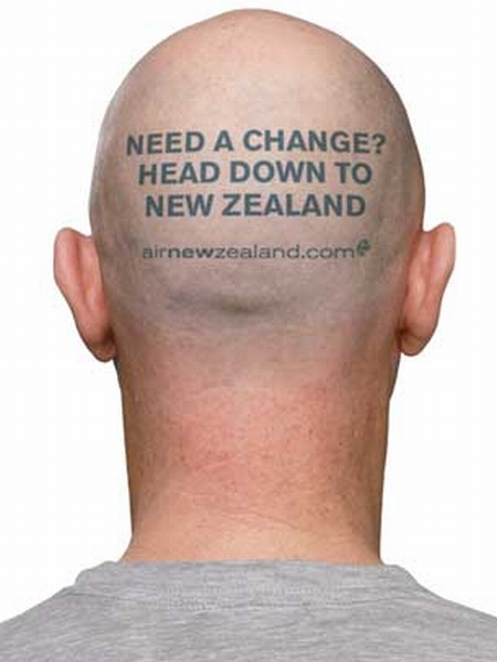 《紐約時報》提到這場很有意思的行銷活動,是紐西蘭航空在去年十一月辦的,為期兩周,找來30位美國人,要他們把頭髮剃得光光,頭殼後面刻上:「想改變生活嗎?來去紐西蘭!」後面還附上紐西蘭航空的網址。紐西蘭航空直接稱這些活動為「頭部廣告看板」(cranial billboards),至於這些「活看板」的酬勞?有兩個選項,一是紐航所提供的價值1200美元的來回機票,一是777美元的現金。後來大約有一半的人拿了機票,一半拿現金,大家都很happy。這樣計換下來,紐航也只花了大約3萬美元(台幣100萬)執行了這麼漂亮的一個行銷專案。