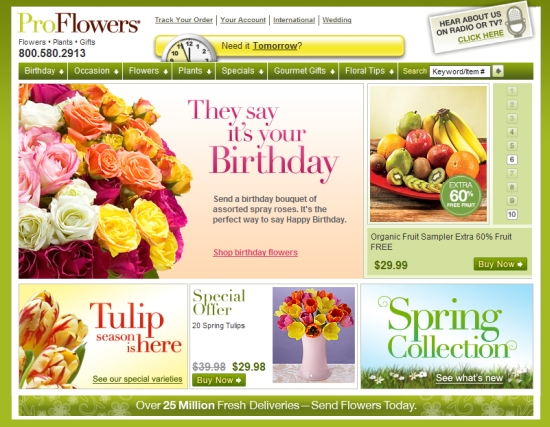 ProFlowers的勝點可能與網路戰無關,完全是產品.因為它在首頁提供了不是花的送禮選擇.餅乾,玩偶.其它3個都沒有
