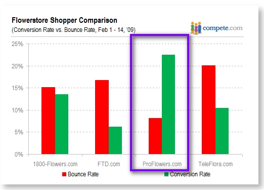 情人節以後,Compete.com對美國幾家線上花店做了事後研究,發現有一個排行老三、老四的競爭者「ProFlowers.com」,在營收方面,竟然佔掉了四家主要競爭廠商總和的一半以上(54%),登上了龍頭寶座!
