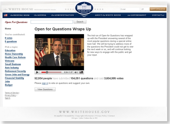 這次的目標不是部落客,而是一位美國總統。全球都在看!或許也是有所顧忌,所以這場活動如龍捲風一樣,來得快去得快,星期二才剛推出,星期四就截止。不過,果然是歐巴馬,太多人要問他問題了,當投票截止時,短短兩天就吸引92,933位網友加入,問了104,081 個問題,投票總數為360萬次!而歐巴馬本人,則依約在美東時間星期四中午時分(我們昨晚的深夜)於白宮正式的舉辦一場「Town Hall Meeting」,選了最多人投票的六個問題回答(有興趣者可見《紐約時報》的transcript),當場並有100位由老師、護士與中小企業主組成的代表也跟著問其他問題,通通選來自華府當地,讓這場真的有點「Town Hall Meeting」的味道。