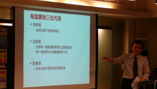 一、教室:原先是訂給十人的教室,最後暴增到18人,中型教室訂不到,所以暫用小教室。還好文大推廣教育部這邊的教室很新,燈光新潮明亮,空調舒適,大理石地板,整體感覺還不錯,不過因為無法上網,有1/3帶著筆電來的形同無用武之地,有的帶了案例來分享的也因為筆電不通而看不到自己準備的資料,加上有一點點擠,大家最後在「教室」類的評分偏低在4.2(84分),下次我會在教室方面特別注意。