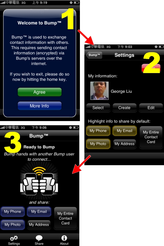 先來看看Bump,如上圖,進去之後它就會先告訴你,以後「撞」到都會不小心傳資訊,ok嗎(第一步)?進入後,它會先要求你先自己為自己做一個聯絡人資料,規格就和iPhone的聯絡人資料幾乎一樣(第二步),當你「準備」好這個聯絡資料,它就好像你的名片,接下來,就會顯示「準備好要碰撞了」的訊息(第三步),等待著另一隻iPhone來和它碰撞!