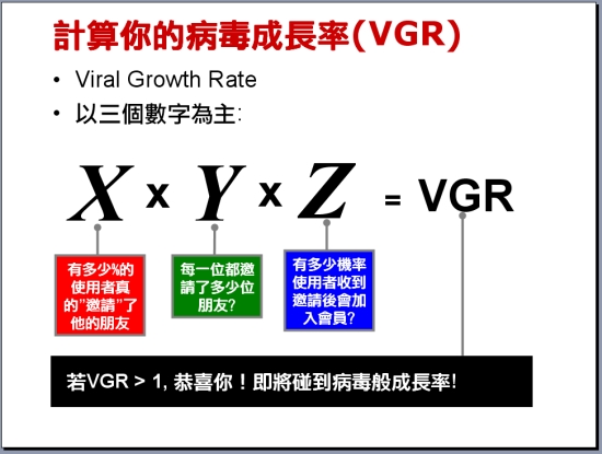 另外,我以之前曾在公司操作過的一個網站成長狀況作為案例分享給學員,該網站在短短時間達到近3萬會員,我以「病毒成長率」(Viral Growth Rate)的計算公式分享給大家,任何一個有「轉寄」制度的網站都可以計算出一個「VGR值」,若此值持續大於一,則每一個會員可以生出更多會員,總會員數將確定成長;若小於一,則所有的流量只是暫時且不穩定。這個公式幫助將一個網站的成長方式拆成三段:一、有多少%的使用者真的「邀請」了他的朋友,二、每一位都邀請了多少位朋友?三、有多少機率使用者收到邀請後會加入會員?我們如何按照這個魔術般的公式將該網站拆解開來,一個參數一個參數的調整,最後調出一道「黃金流程」,將我們網站的VGR超過1並與之最大化等等。