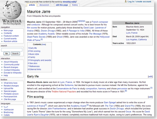 上星期爆出一則很有趣的新聞(其他報導如這裡、這裡、這裡),法國作曲家Maurice Jarre在三月去世,全球哀悼,許多報紙紛紛開始報導他的事,講他講的東西,沒想到,過了一個月,有報紙發現事態不對──