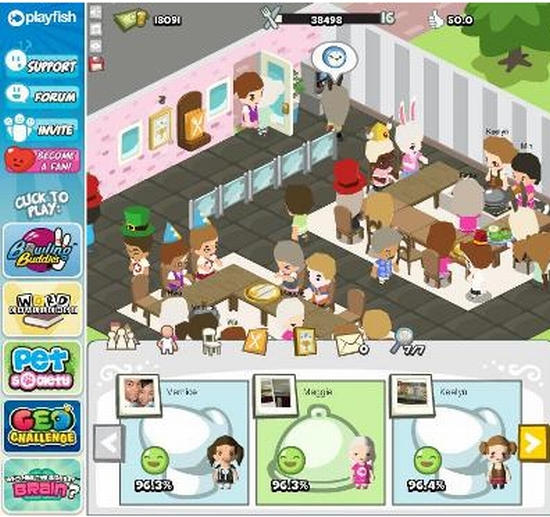 其中全球最大的功臣之一,就是「Facebook」,它的外掛插件平台一開始被拿來做一些較網路傳統的應用,近期都是拿來做遊戲。徐先生表示,Facebook的插件小遊戲的開發門檻極低,有的只要3周即有機會可完成,較棒的做個3~6個月也可完成。徐先生介紹了一下這些社群的遊戲,其中最大廠商為Zynga,它旗下所有小遊戲總合起來,共掌有高達4000萬活躍用戶,佔整個Facebook的20%!它旗下擁有高達30款以上的遊戲,最紅的是樸克牌遊戲「德州樸克」。Zynga的模式說明了小遊戲的成功之道,徐先生表示,Zynga的遊戲非常注重數量、種類,它的收費模式相較之下非常覆雜,有廣告、贊助、道具收費、會員收費、增值業務…。它善用免費的點數促使你天天回來玩,你輸光了,他明天再送你1000點,目前Zynga也「賺翻了」,傳說中,Zynga一年營收高達1億美元!而在Facebook上面的第二大遊戲廠為Playfish,它的風格和Zynga迥異,較為精緻,重遊戲性,但遊戲款項較少,只有六款遊戲、共2560萬活躍用戶,但Playfish靠不同的風格,收入也有高達3000萬美元,在北京設有分公司。徐先生說,以上的案例對創業家是一大鼓勵!因為這些遊戲,大多以朋友互動為重心,使用者最重要的動力是受到認可、表現自己(也是徐先生所說的華人最care的「面子」問題)。創業家與大場競爭極有利,因為這些題材皆不需要知名度(朋友介紹就是認可),因此也不需要必須是哈利波特、星際大戰,不需要3D動畫。現在大家唯一還有的疑慮是Facebook過深的仰賴,萬一哪天Facebook和遊戲創業家「翻臉」怎麼辦?因此許多遊戲創業家的策略都不忘支持多個平台,至少MySpace和Facebook都要支持才行。這場Sweet100真是充滿遊戲風,在演講的中間,徐先生當場上網示範玩了一下Zynga的優界(Yoville),徐先生說,這是Zynga做得比較好一點的遊戲,也示範了Playfish的寵物社會(Pet Society)遊戲,每個按鈕都是很花花綠綠的,他也示範了Playfish另一款遊戲「Restaurant City」,裡面有十幾個、二十個角色一起在動,已經是個相當複雜的遊戲。