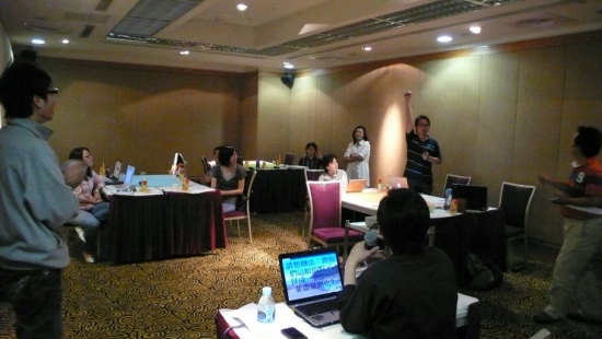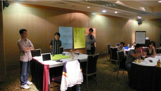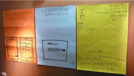 第一場討論,我們請各組人馬想辦法將他們自己帶來的「點子」(一開始每個人都有講點子),想辦法勉強整合成一個大點子,然後予以「盡量簡化」。我們是希望藉這段不合理的過程、看到點子膨脹之後再收縮,來讓大家感受到「網站簡化」的重要,大家「比比看誰的網站最簡單」,三組使出渾身解數做出全世界最簡單網站,有一組以搜尋引擎的介面搜尋某個時間的某個人在某個地方並和活動結合,有一組透過手機介面做出簡單的社群系統(天啊,無巧不成書,這周在Android平台剛好有個超棒的新應用Glympse出來很類似),另一組則以更直覺的「畫一個人體」上面點擊來操作這個網站。我還鼓勵「毒舌」,每組也真的毫不客氣,還蠻毒的。