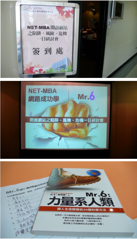 網路上沒有絕對正確的答案,最好的學習方式就是彼此分享成功經驗,這是Mr.6部落格特色,每天提出案例並予以分析。抱著這樣「拿知識交朋友」的心情,我設計了這麼一系列課程,原本叫「Mr.6部落格課程版」,後來別人建議應該取一個名字,在集思廣義後創立「NET-MBA網路成功案例課程」,簡稱「NET-MBA」,就是希望用MBA的心情來討論NET(網路)的種種,也用NET的經驗來分析MBA常分析的一些案例。