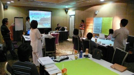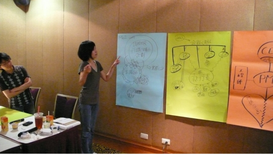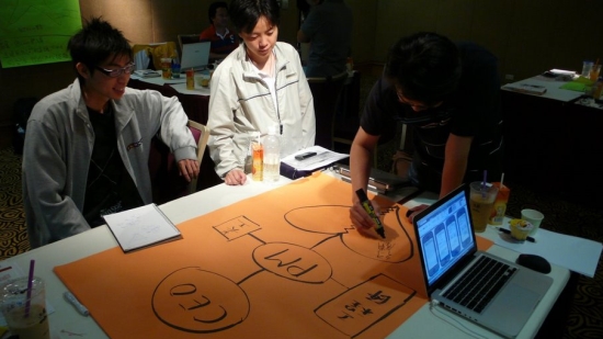 第二場討論,我們以第一次討論的其中一個網站為範例,一起模擬製作這麼一個網站,所需要的人力為何,要不要外包,最重要的是我要求同學「畫」出這些「成員」之間的「關係」。這個活動一開始大家似乎不覺得有什麼,但run了以後才發現,同樣一個網站,大家畫的「人」的分工有很大的差異,有的學員強調每個獨立個體各有任務,有的則緊緊相連;有的有想到各種「缺一角」要怎麼備援?有的則好像分布不均,放了重點在其中幾個人身上………透過這樣「畫出來」的方式,同學可以更侃侃而談,從一個網路行銷人員、業務、經營者、資方、CEO、工程師、設計師(我們大概就只缺MIS沒到),彼此之間曾經有過的團隊相處經驗,應該怎麼做等等。
