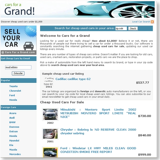 這個網站叫「CarsForAGrand.com」,也就是「1000元以下賣車」的意思。這個創業家專門從eBay的資料裡,撈出「1000元以下」的超便宜的二手車。大概是定位非常明確,據報導這個網站目前已為創辦人帶來「高的六位數(美元)的營收」,也就是說……至少已經賺了一棟房(在台北可買兩棟房)的意思!換成台幣,至少有1000~2000萬。