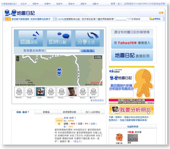 但是,也在這時候,Jerry和Andy開始很擔心,因為「user profile」看起來怪怪的,感覺上user名單上中,有很多人本來就是Web 2.0這個圈子的關注人士,感決上台灣的重度使用者好像快被洗完了。而且另一點是,這時候地圖日記的男女比例為「9:1」,而且上面有好多工程師,很感謝這群工程師一開始對這個站的包容,他們也說,因為他們自己的產品也會寫出bug,所以對初期的地圖日記的功能很是包容,又給得出真心的建議。不過,直到有個好朋友看了地圖日記,來信說這個站的定位有問題,因為它的使用者全是「專家」,似乎沒有抓到大眾?這時候,地圖日記認知他們不可能在產品完整上和別人compete,因此也就在此時,開始想辦法要改變user profile。他們分析了一下自己的強項,知道他們的長處是在「創意」(因為只要一個人也能想出好創意) 和「溫情」(有了上次對大家留言成功的經驗),於是,就做了一場開幕活動,這場活動的主要目的,就是擴大user的族群,到更「廣」的狀態。這時候也開始送獎品,讓每個人可以來線上剪綵,然後有艘船。之前大家在別的地方看到的地圖都是資訊用途,可是這艘船讓大家把沒中獎的彩券丟上去,然後讓大家投票決定這艘船要開到那裡,大家還可以決定自己要擔任什麼職位(船長、大副…),最後,網友決定要開到月亮上………。這個活動很成功!