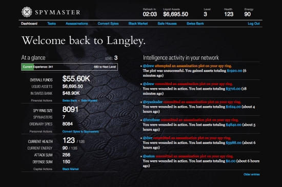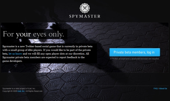 美國有間小網路公司叫iList,他們團隊成員趁業餘時間做了一個小遊戲,就在這周末,紅爆了全美國,周末期間,所有人都在講這件事情!這是一個叫「間諜大王」(SpyMaster)的……呃,Twitter小遊戲。周末期間打開twitter,就會發現右側欄的「trending topic」的第一個就是「#SpyMaster」,現在它還在封閉測試中,有興趣者可在twitter裡送個訊息給「@playspymaster+I+want+an+invite!」即可收到他的邀請,然後就開始玩了!