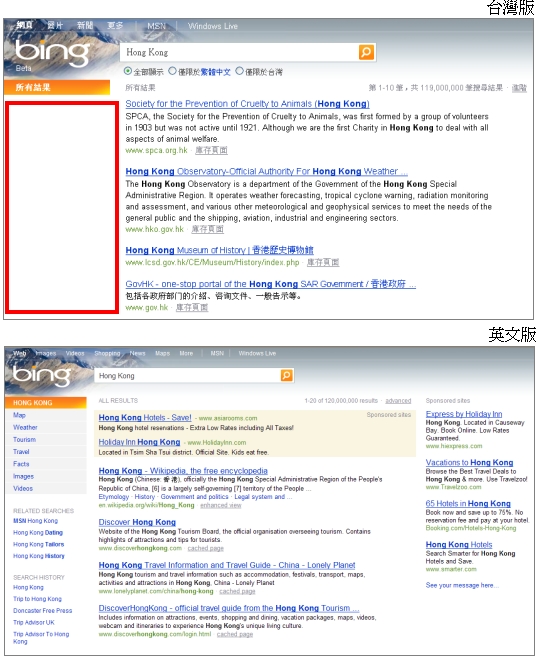 然後,以在台灣來看,Bing卻做了一個不好的示範。由於Bing並不是全球同步推出,在台灣這邊,它卻急著將Bing這個logo放上去開始讓大家用(裡面似乎和Live Search沒兩樣),結果就如下圖,並沒有把「Bing的最好一面」表現出來。在台灣版只能看到網頁、圖片與新聞三種搜尋,那個「殺手級左欄」幾乎從頭到尾都在睡覺,搜尋者必須親力親為,也造成這裡許多網友「誤解」,對Bing的初步印象「沒這麼好」,譬如重灌狂人不來恩以「bing桌」(翻桌)、「Bing病了嗎」來表達對中文版的失落,IT黑傑克也對Bing台灣版初步表達失望,但在幾小時後立刻再補充「對英文版印象深刻」。而根據前晚這篇給人的觀感是,台灣微軟要處理Bing這件事,似乎比想像中困難許多,報導中至少有兩部份要處理:一、與合作廠商的合作模式與細節處理,以及二、技術性上面的問題如台灣與美國的資料庫尚未完全整合。這點,也給大家一個警惕,網站推出,尤其是像Bing這樣的注目焦點,在全球每個地區幾乎都是同時散播出去,算進時差、日夜顛倒,頂多慢個一天,一天半。像台灣這次,幾乎上星期網友就已經在討論Bing,但他們一上去Bing,因為是設定成台灣,且台灣版還是最陽春的版本,有些網友馬上透露「失望」。像微軟這樣國際級的大企業早已在全球各地「在地化經營」,各地區的分公司當然無法立即跟著總公司,而且還有自己的合作廠商要處理,無法立刻完全轉化,輕微者只是「錯失第一時間的行銷時機」,若弄不好甚至產生這次的一些「誤解」,剛好與美國那邊極力宣揚「強勢happy」的恰恰相反,之後或許得花更多的力氣去將這種「失望」扳回來,讓大家知道一切只是誤解,頗為可惜。