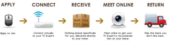 這個「一大箱俱樂部」,它讓你先填一個表格,Trunk Club就會與你聯絡,利用人人幾乎都有的Webcam攝影機頭,加上Skype,得到你的大概身材、身高等等。接下來,Trunk Club竟然直接用快遞寄「一大箱」(故得此名)的褲子、衣服…到你家!不讓你選花色喔,直接寄到你家,然後你再上Skype,接Webcam,現場穿起來給站方所請來的「Trunk Club專家」來看看!你不喜歡的,可以再寄回來,然後只需要付你最後留下來的那一批衣服,之後Trunk Club再寄新的給你。Trunk Club號稱他們很有經驗,這段「線上看你穿」的時間不會太久,大約只要15分鐘(他們也不希望看太久),他們就知道怎麼樣讓你更滿意!