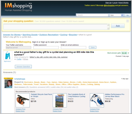 繼Dell透過Twitter微網誌創下一億台幣的業績後,另一家公司也在這星期傳出另一個驚人透過微網誌的業績成果叫作「IMShopping」。「IMShopping」是一個「人肉搜索商品」的服務,本身已籌了470萬美元(台幣1.4億)的資金。你到了IMShopping大首頁,上面就是一個大大的框框,要你問一個「找商品」的問題,什麼都可以問,什麼都可以買。譬如:「我在哪裡可以找到某某某NBA球員的球衣呢?」「我在哪裡可買到1000元以下的不錯的廠牌的電冰箱呢?」然後,開放給網友去回答。