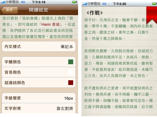圖/Hami平台書籤呈現方式與書籤功能(左)與Hami書城閱讀設定自訂(右)