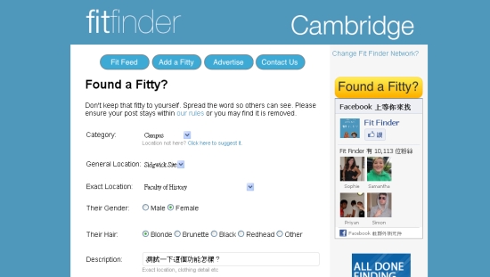 不過,Fitfinder也懂得「簡單」的原理,雜七雜八的機制,Fitfinder似乎全都省略掉了,包括聽起來應該很重要的「回報機制」,譬如,如果你就是那位美女,想不想站出來「承認」,與那個人「相認」呢?但Fitfinder並未設置任何「當事人澄清專線」!換句話說大家真的只是在玩一玩而已,它也不允許留電話之類的,搞不清楚要怎麼搭上線。