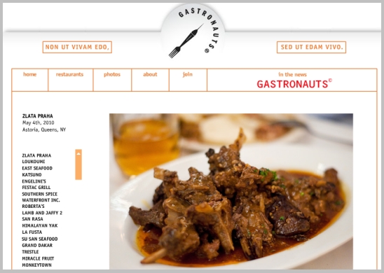 主辦單位不必什麼成本,只需要一顆真正愛吃的心,他們兩位負責找餐廳,照著該餐廳的菜單,自己設計一些不可思議的食物,然後,和餐廳說好,就可以舉辦一場活動了。一開始餐廳不見得願意配合,所以他們必須自己帶東西去餐廳吃,譬如,他們曾經找到紐約的一間尼泊爾餐廳,打算帶大家去吃「犛牛」,沒想到,那家餐廳到美國已經同化,沒賣這種東西了,他們只好自己從佛羅里達州那邊想辦法找到人進口了一批40磅的犛牛肉,送到該餐廳,要他們照著他們傳統的方法烹煮。到了後來,我可以想像,餐廳一看到其他曾參與過的長乎乎的名單,再看到每一次留下的照片,就會主動爭取,這時候Gastronaut的主辦單位就可以輕鬆的賺差價,有些小收入。