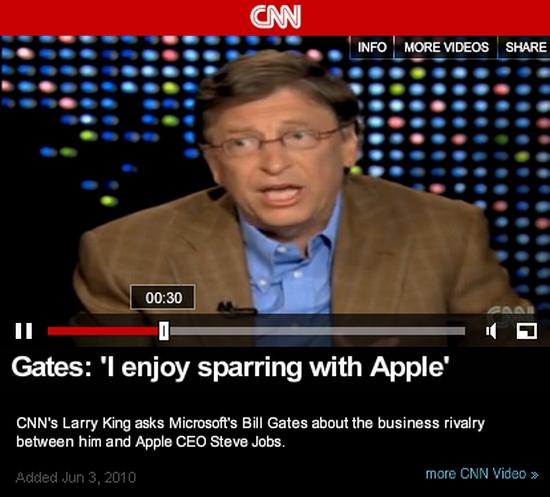 「我當年曾在蘋果寫了BASIC程式,後來微軟公司比世上任何公司還寫了更多蘋果的程式。」比爾蓋茲說:「也就是說我們雖然作業系統上面競爭,但我們也是合作伙伴!」