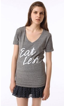 第一則是一件看起來沒什麼的「T-shirt」衣服,如圖示,一位模特兒,穿著一件衣服上寫「Eat less」(吃少一點!),這還是由大型衣服公司「Urban Outfitters」所推出的新款式的商品照片,沒想到,據報導,引發了滔天大爭議!