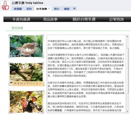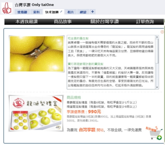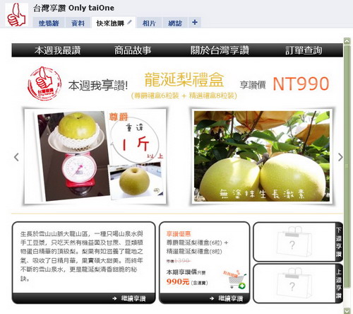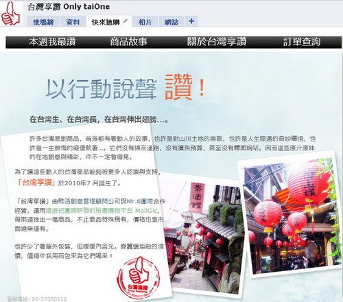 版主特別補註:「台灣享讚」結合多方資源,由知名的SOHO協會理事長張庭庭老師領軍,參與者包括Heeyuki嬉遊紀、Mr.6行銷團隊與夥伴Vincent、David Chang、Ben Lin,皆為網路身經百戰的高手,它是第一個針對facebook來推廣的台灣在地特色產品的平台,實驗精神高,野心很大,請各位重度網路人可以多多分享,接下來會一檔接一檔的推出!