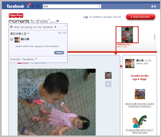 到底是什麼樣的「行銷網站」呢?其實,就是一個facebook的應用程式,稱為「Moments to Share」,可以讓父母上傳兒子和女兒的相片、影片,然後標註一個時間,它就會以「時間軸」的方式來呈現,非常漂亮、簡單,還可以同時看到其他朋友的時間軸。之前其實已經看過這個行銷活動案例,但一直到今天看了此文章才知道原來這個app的概念基礎是來自一個「狗仔隊網站」的點子,狗仔隊做不成,就拿同樣的時間軸的呈現,拿來給父母上傳相片!幾乎可以看到去年這幾位創業家將他們失敗的「狗仔隊」軟體給Fisher-Price的行銷人員看,他們拍桌:好,我要這個!給父母!旁邊再秀出適合該歲孩童的玩具,於是,就和這創業家「成交」了!