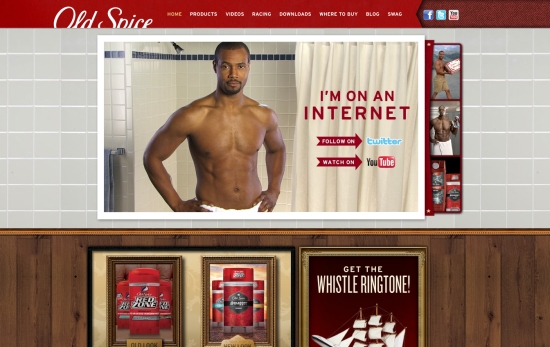 原來,此香水品牌是先開了一個叫「Old Spice」的twitter微網誌帳號,但,在這段期間,他請大家問他們「問題」,有一個人(就是畫面上的強壯黑人),會針對這些問題,錄一段影片「回應」。聽起來很像是以前的德薇小姐和更以前的漢堡王大雞人的翻版,但前者是很炫的「自動留言」,而這次的這位黑人帥哥,則完全沒有技術在裡面,他只是站在同一個浴室的佈景面前,針對網路上的訊息,錄一段20秒的「回覆」,所以,每一則影片的標題都是由「Re:」開頭,告訴你他正在回覆哪一位的留言。