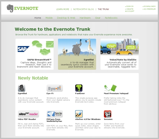 今天,我們更尊敬Evernote了!因為,竟然看到,Evernote開了一個……「App Store」,他們內部是稱作「Trunk」,但意思就是App Store,大家看這個字就知道什麼意思,蘋果的iPhone可以吸引幾十萬支程式在蘋果自己的「App Store」上面販賣,每一支他們都可以抽成,但蘋果是蘋果,為什麼EverNote這麼一間「小公司」,竟然也可以開一個「App Store」?