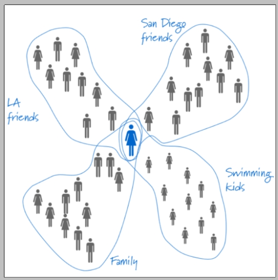 先看這份研究,更進一步的將這個「表現不一」的狀況給數字化──事實上,在我們100多位、300位facebook的朋友之中,其實是被拆成「好幾組」的,科學家已經算出來,每個人的生命裡的「群組」大約是四~六組,每一組由不到10個人組成,然後再有一些無法分類的零星的幾位朋友(佔極少數),他們找來了好多人來做實驗,比如上面那張圖中的日本人,他的生命就是被分成六個組,有一組是「同事」,一組是「曾經在某地認識」,一組是「同學」,另一組是「親人或親人的朋友」……,這些都是不一樣的群組,雖然都是你的朋友,但是他們正在被你以「不一樣的態度」對待著。